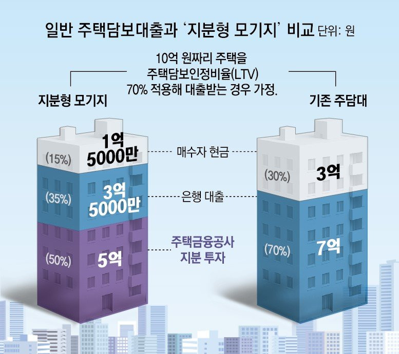 ‘영끌’ 문제를 해소하기 위해 주택의 지분을 쪼개 매입하는 제도를 도입하려는 시도가 잇따르고 있다. 주택을 주식처럼 만들어 공공이나 민간의 투자금을 끌어와 매수자의 은행 대출 부담을 낮추겠다는 취지다. 집값 하락 시 손실 부담 등 풀어야 할 과제가 적지 않아 현실에서 제대로 작동할 수 있을지 회의적이라는 반응도 나온다.금융당국에 따르면 금융위원회는 6월 중 ‘지분형 모기지’에 대한 구체적인 로드맵을 발표할 계획이다. 지분형 모기지는 개인이 집을 살 때 정책금융기관인 한국주택금융공사(HF)가 지분 투자자로 참여하는 방식을 말한다.지금은 10억 원짜리 집을 사려면 매수자는 주택담보인정비율(LTV) 70%를 적용해 7억 원을 은행에서 빌리고 3억 원은 현금으로 마련해야 했다. 하지만 주금공이 5억 원을 투자한..